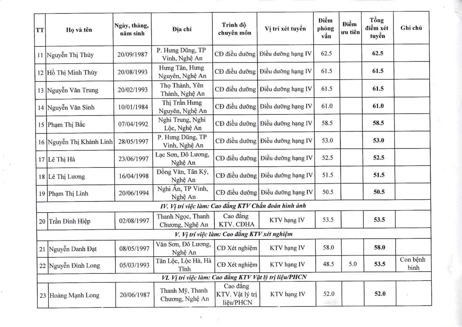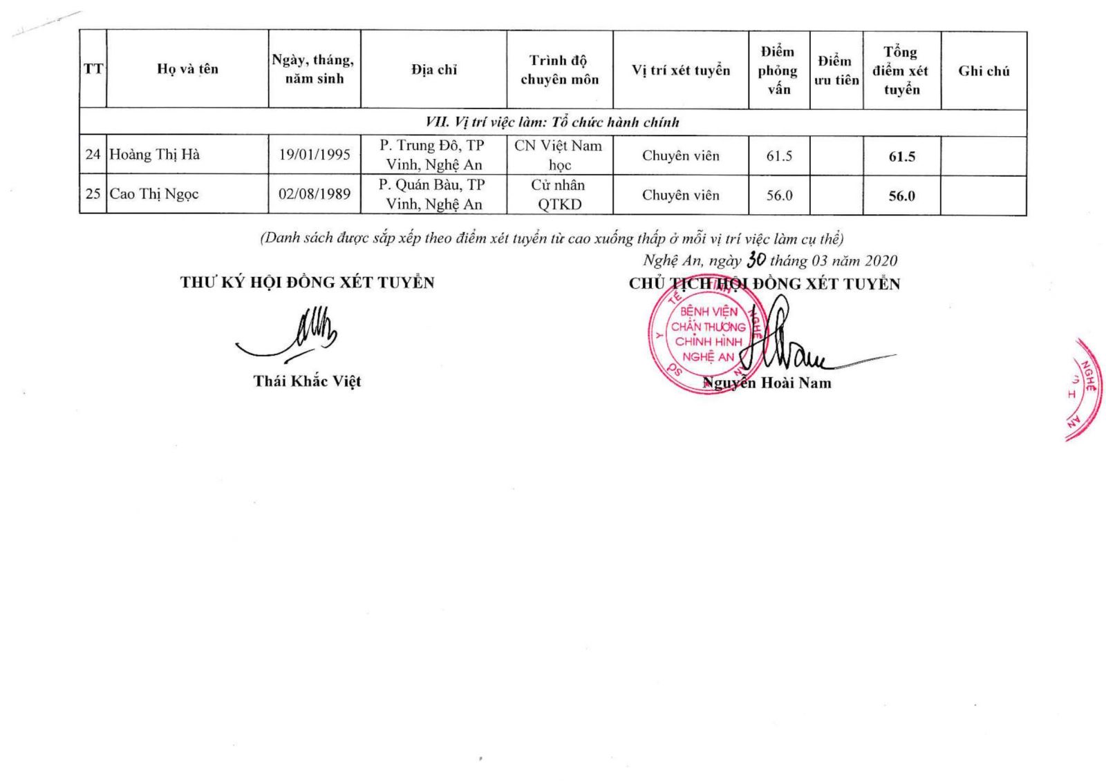 Bệnh viện Chấn thương Chỉnh hình Nghệ An thông báo bảng tổng hợp điểm xét tuyển viên chức năm 2020 như sau:
