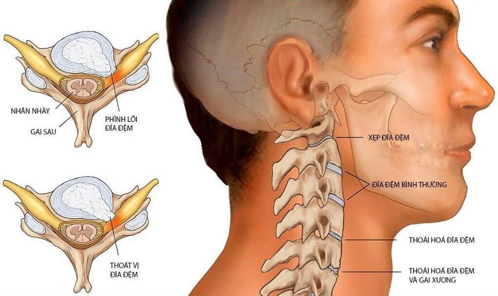 – Thoát vị trung tâm hoặc cạnh trung tâm gây chèn ép tủy cổ, dẫn đến yếu cơ tứ chi, rối loạn cơ tròn. Các triệu chứng thần kinh tiến triển càng nhanh càng cần phẫu thuật sớm.