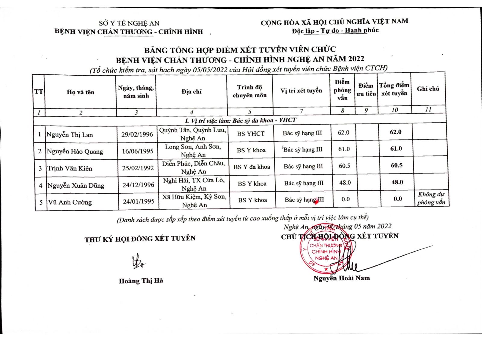 Bệnh viện Chấn thương - Chỉnh hình Nghệ An thông báo bảng tổng hợp điểm xét tuyển viên chức năm 2022 như sau: